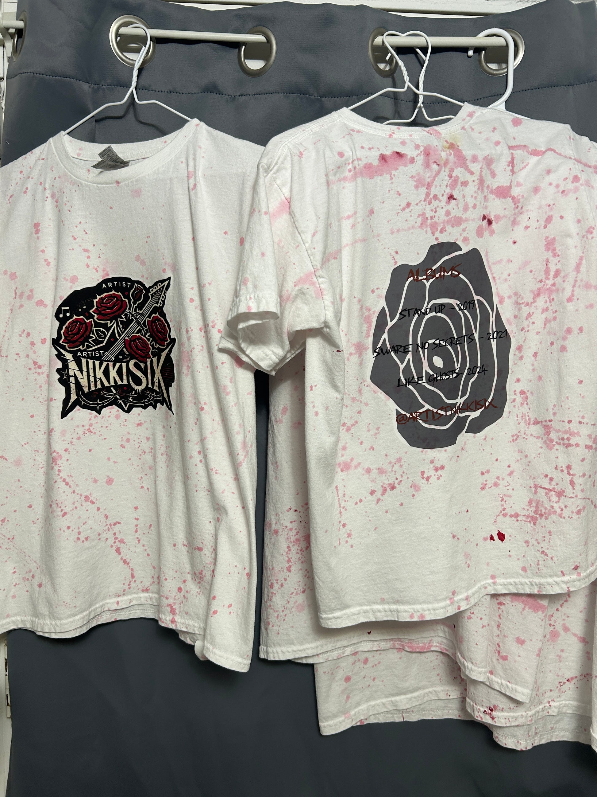 White, cotton Nikki Six T-Shirt, back design Rose with Albums and released date. Will be personally song by artist.